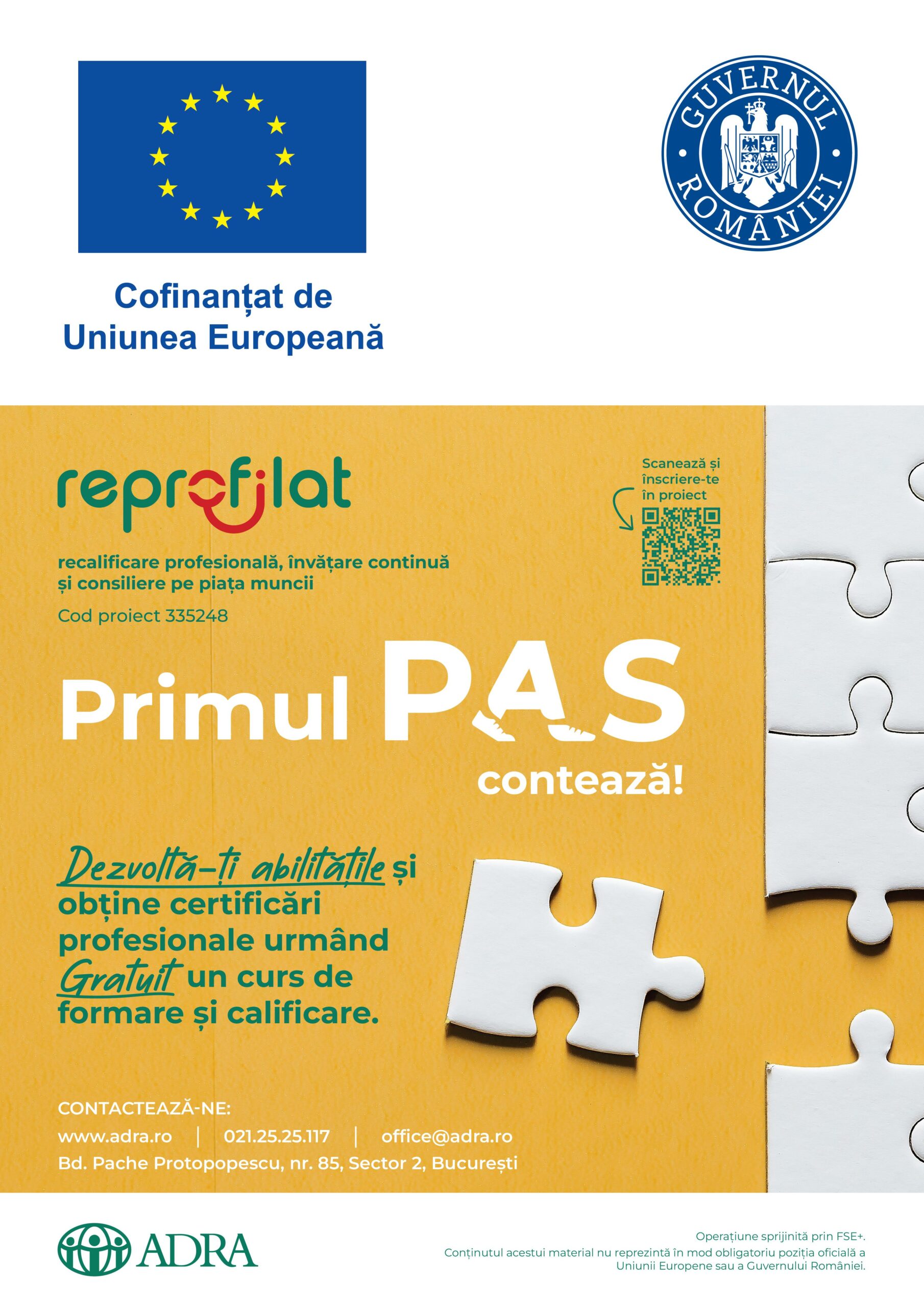 Proiectului „REPROFILAT – recalificare profesională, învățare continuă și consiliere pe piața muncii”, Cod MySMIS 2021+: 335248 implementat în prezent de ADRA ROMÂNIA în județele Timiș și Hunedoara – Regiunea Vest, este un program dedicat sprijinirii persoanelor cu nivel scăzut de formare, aflate în căutarea unui loc de muncă sau a unei recalificări profesionale. Operațiunea este sprijinită în cadrul Fondului Social European Plus (FSE+).